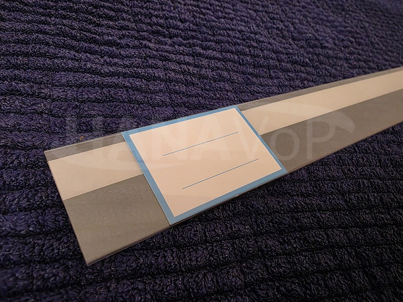 Regálové lišty vyrábíme z kvalitního čirého PVC tloušťky 0,4-0,5 mm. Je určena pro vkládání štítků, čárových kódů a popisků na prodejních a skladových regálech, prezentačních stojanech, vitrínách apod. Lišta je opatřena kvalitní čirou samolepící páskou tloušťky 0,15 mm, která je vhodná k lepení na hladké povrchy - sklo, lakovaný plech apod.