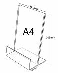 Vyrábíme z čirého plexiskla tloušťky 2mm s UV ochranou. Přední strana stojánku je šikmo k podložce a je složena ze dvou částí mezi něž se vkládá zpravidla 1.list papíru velikosti 210x297mm.