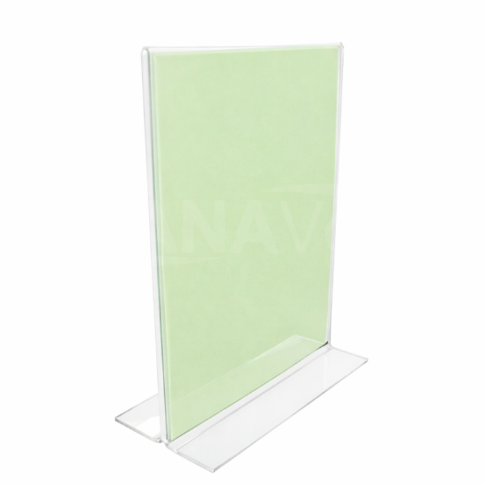 Vyrábíme z čirého plexiskla tloušťky 2 mm s oboustrannou UV ochranou (aktivní vrstva zabraňující žloutnutí plastu vlivem slunečního záření.) Obě strany stojánku jsou kolmo k podložce, vkládaný text je tak čitelný z obou stran stojanu. Slouží k označení výrobků na výstavách, veletrzích a obchodech. Označení "TV" - orientace stojánku na výšku. Formát vkládaného papíru A3 (420 x 297 mm.)