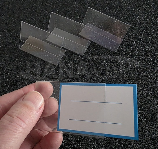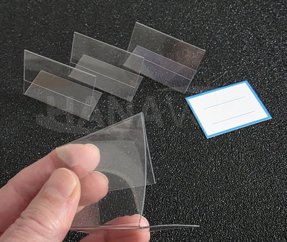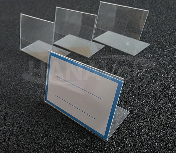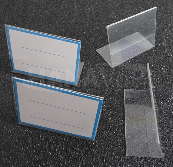 Stojánky tvrdé, průhledné. Slouží k označování výrobků na výstavách, veletrzích, obchodech, atd. Vyrobeny z čirého plastu tl. 0,5 milimetru. Jsou ohebné, odolné proti poškození, nepraskají. Dodáváme s předtištěným tvrdým papírem uvedených rozměrů v barvě modré a šedé. Otočením stojánku jej můžeme použít i způsobem „na stříšku". Orientace na šířku. Rozměry v mm.